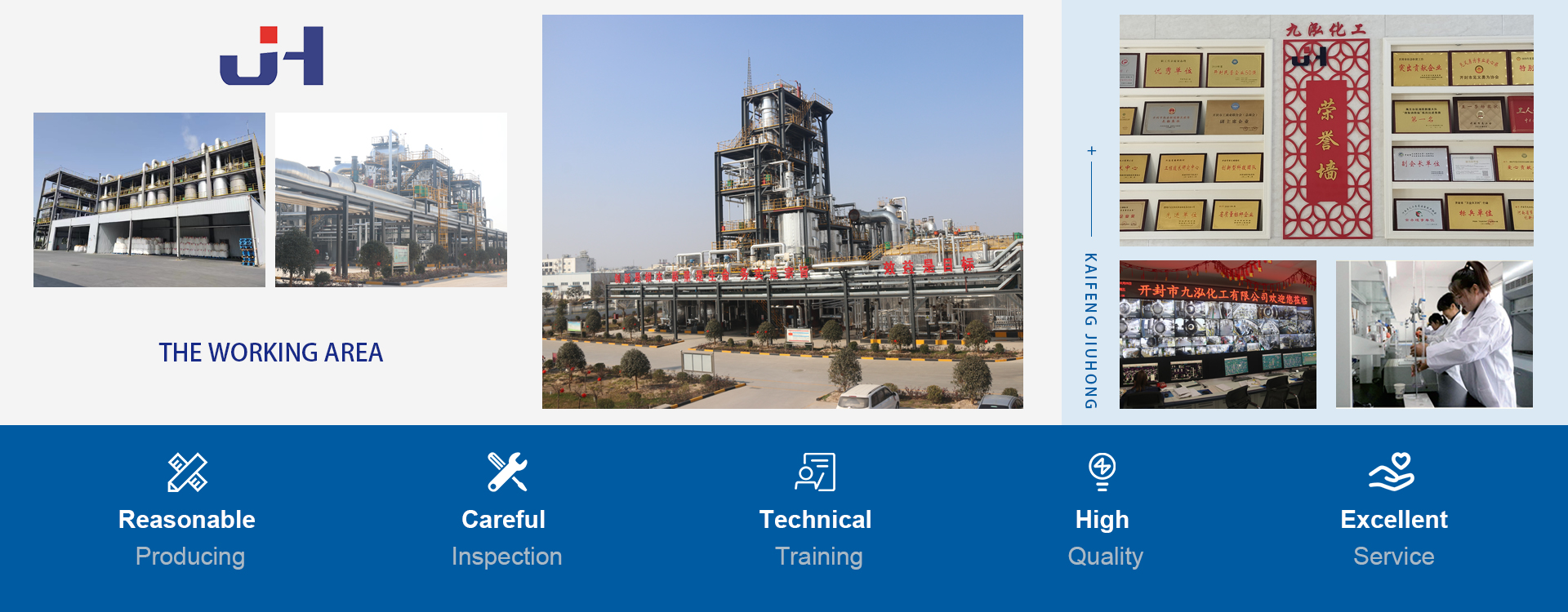 Kaifeng Jiuhong Chemical Co., Ltd. was founded in July 2014, located in Kaifeng city,Henan Province, the middle of China. The detailed address is in No. 3, Suzhou Road West Section, Fine Chemical Industry Agglomeration Area, Yuwangtai District, Kaifeng City. Our company has a registered capital of 280 million yuan, covering an area of 400 mu, with a total investment of 1.2 billion yuan and more than 600 employees.
